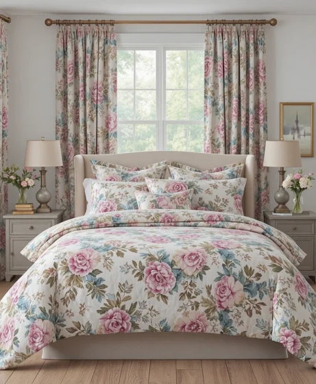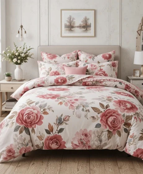Rose patterns in soft pinks and reds create a romantic bedroom vibe. Combine with layered pillows and cozy lighting for a warm, intimate atmosphere perfect for winding down.