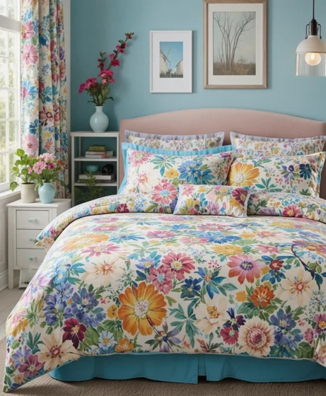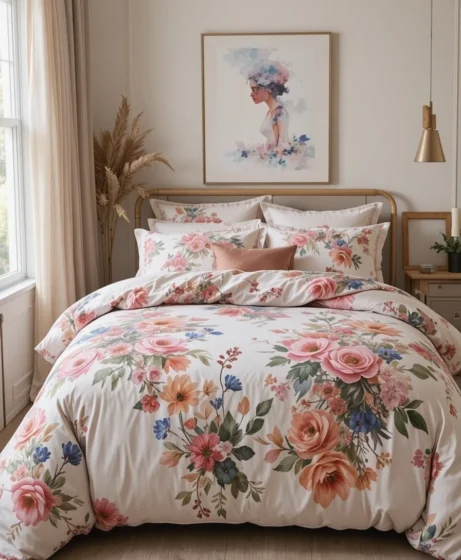 Watercolor-inspired floral bedding looks soft and hand-painted. The blurred edges and blended colors create a romantic and dreamy bedroom atmosphere. This style pairs beautifully with neutral walls and subtle decor.