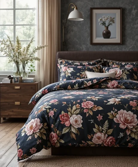 Dark floral bedding with black or charcoal backgrounds creates a bold, moody aesthetic. This idea works especially well in rooms with warm lighting and rich wood furniture.