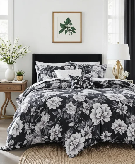 For a modern twist, choose black and white floral bedding. This timeless color combination feels sophisticated and works well in minimalist bedrooms. Add metallic accents for extra polish.