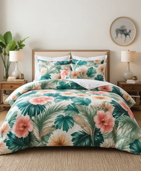 Bring vacation vibes home with tropical floral bedding featuring palm leaves and hibiscus prints. Bright greens and coral shades add energy and warmth, making your bedroom feel like a getaway.