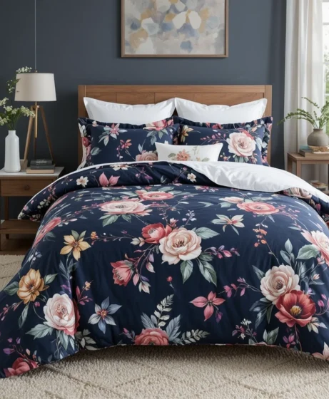 Navy floral bedding adds depth without overwhelming the room. The dark base makes colorful blooms stand out beautifully. Pair with soft white pillows to balance the look.