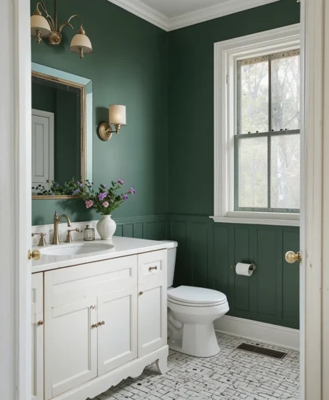 Gives a vintage, moody, and luxurious vibe to bathrooms Forest Green Paint Colors.