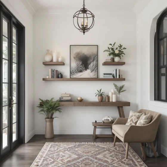 Stylish floating shelves allow you to showcase décor without overcrowding. Display candles, books, small plants, or seasonal items for a personalized touch Foyer Decoration Ideas.