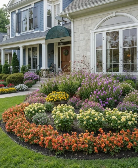 Create depth by planting flowers in layers, with taller plants in the back and shorter blooms in the front. This design adds dimension and makes your front yard garden look full and organized. Choose seasonal flowers for year-round color.