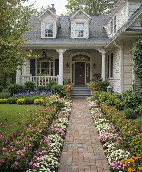 Line your walkway with colorful blooms for a cozy cottage feel. Mixing different flowers creates a charming and inviting atmosphere. This design works beautifully for traditional homes.