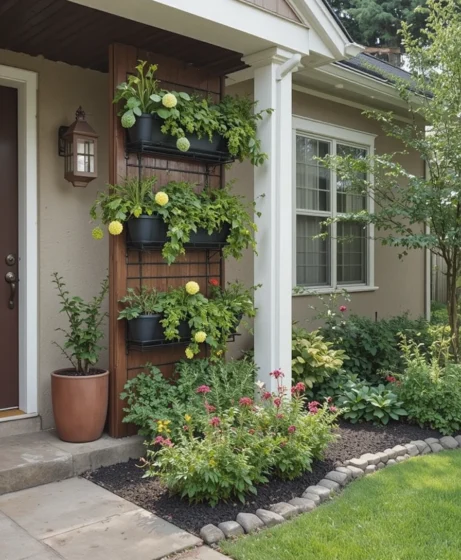 Install a vertical planter wall near the entrance or fence. This idea is perfect for small front yards. It maximizes space while adding greenery and visual interest.