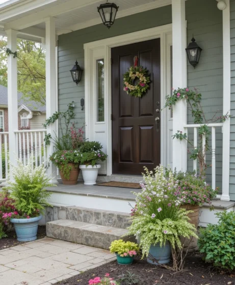 Place decorative pots filled with seasonal plants on your porch. Container gardening allows flexibility and easy updates. You can switch plants based on seasons or holidays.