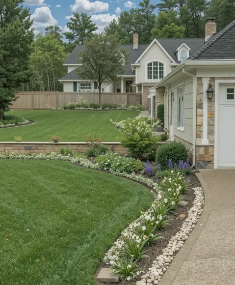 Maintain a healthy, trimmed lawn with crisp edging along sidewalks and flower beds. Clean edges instantly make your yard look neat and organized. Regular mowing and watering keep the grass vibrant.