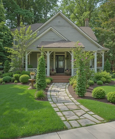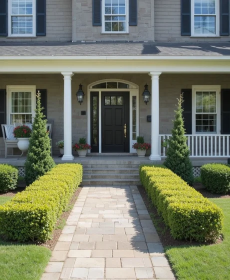 Plant matching shrubs on both sides of your entrance. Symmetry gives your front yard landscaping a polished and elegant look. Boxwoods or evergreen bushes work well for this classic design.