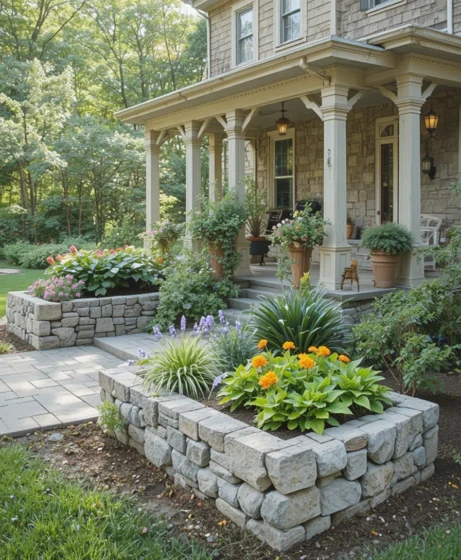 Add raised stone or brick planters near the porch or walkway. These structures create height variation and define your garden areas. They also make planting and maintenance easier.