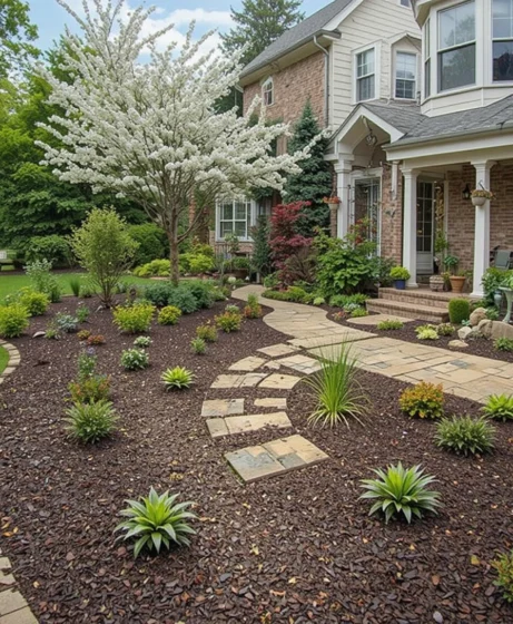 Cover garden beds with dark or natural-colored mulch. Mulch keeps soil moist and prevents weeds. It also gives your front yard landscaping ideas a clean and finished look.