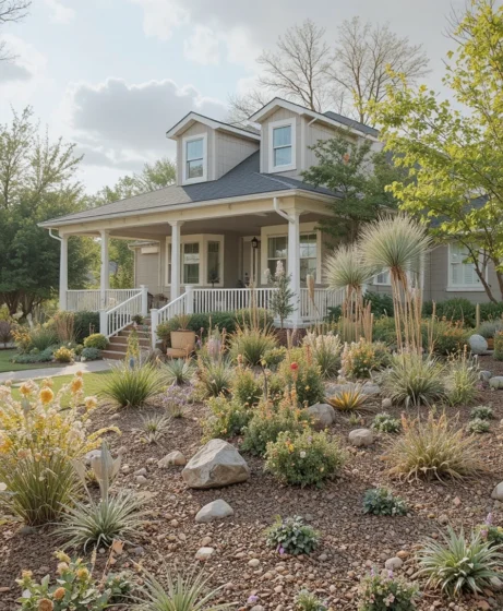 Combine rocks of different sizes with drought-tolerant plants. A rock garden adds texture and is perfect for dry climates. This is a smart solution for homeowners looking for low maintenance front yard landscaping.