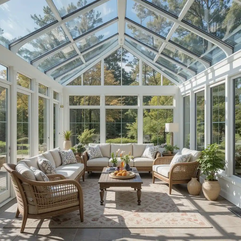 A glass ceiling floods the room with natural light, creating an open and airy feel. It’s perfect for stargazing at night and makes small sunrooms feel larger.