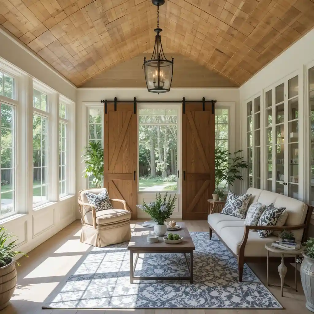 Sliding barn doors separate the sunroom from other rooms in a stylish way. They add character and allow easy transition between spaces.