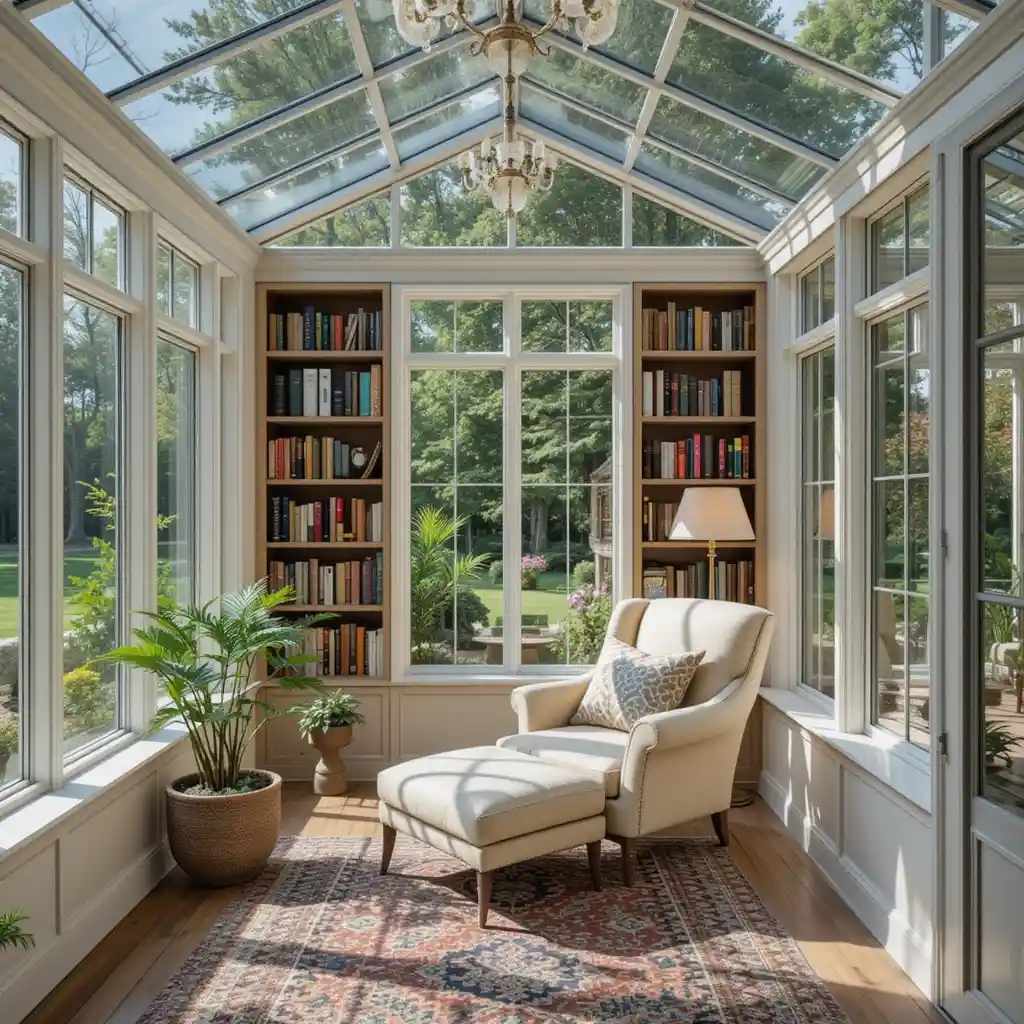 Tuck a plush armchair and bookcase into one corner of your glass sunroom. Surrounded by daylight, it becomes the perfect place to unwind with a novel.