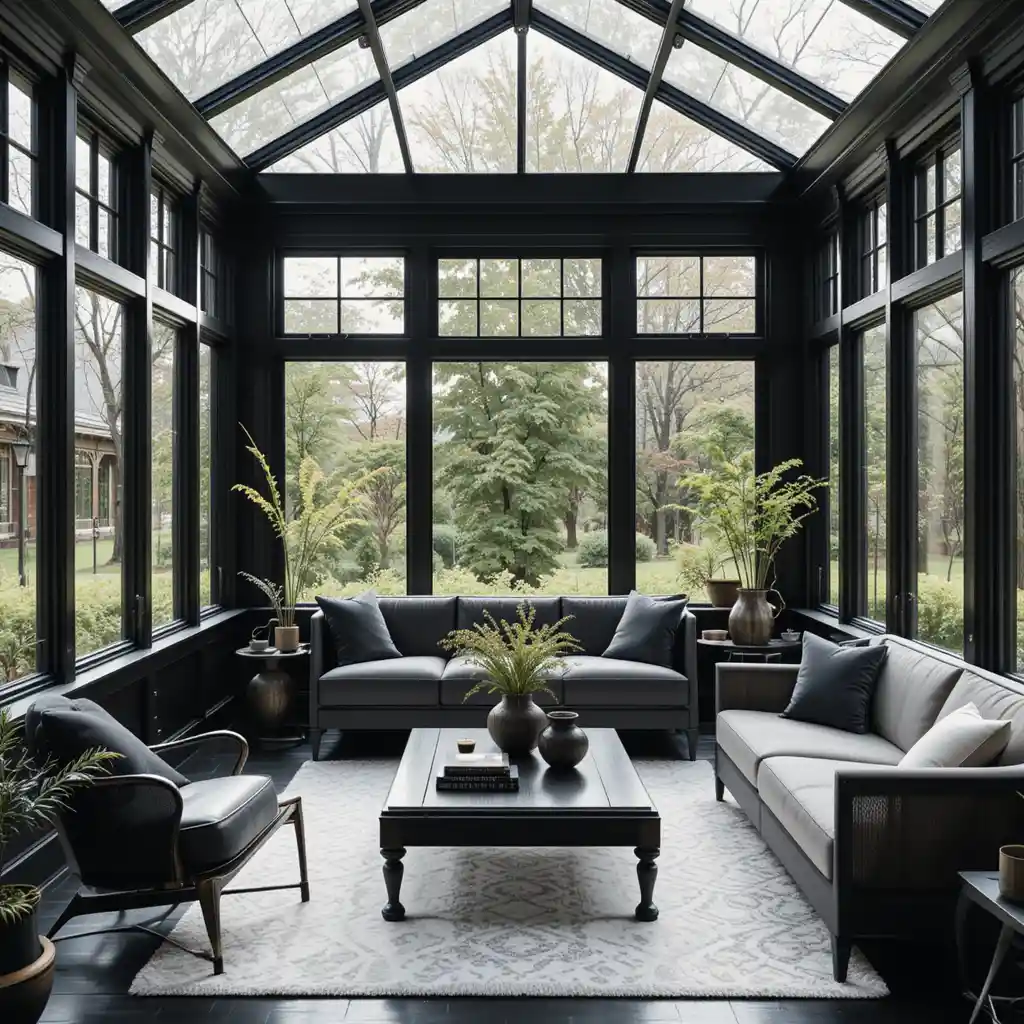 Design the sunroom in all-black tones with matching window frames, flooring, and furniture for a chic, dramatic effect. The glass contrasts beautifully with bold dark colors. Glass Sunroom Ideas