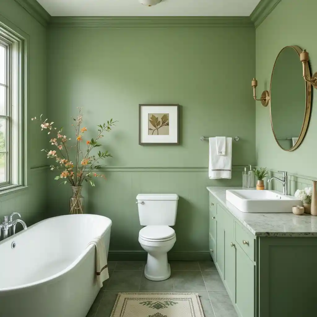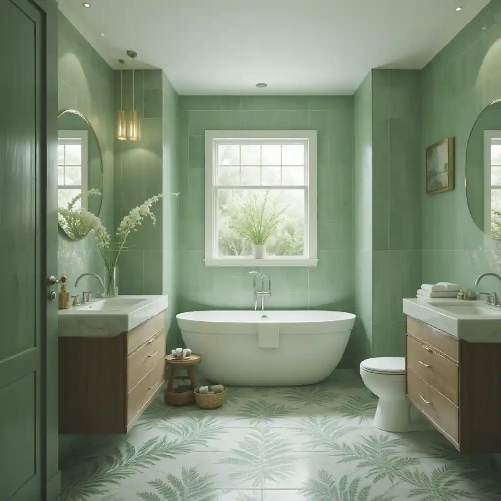 Sage green walls bring a soft, earthy feel to your bathroom. Pair them with crisp white sinks and tubs for a clean, modern contrast that feels both cozy and refreshing.