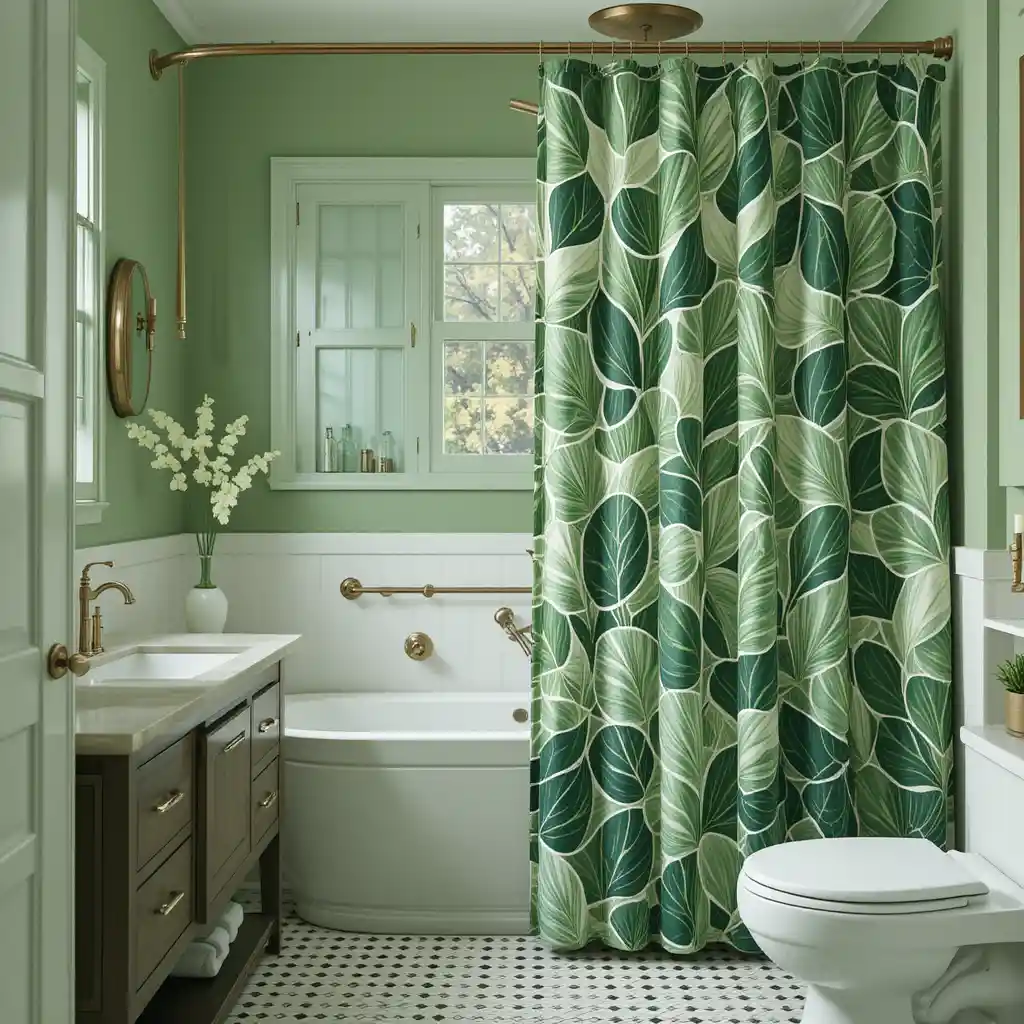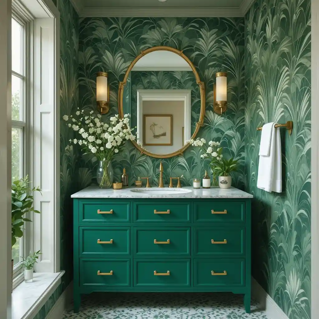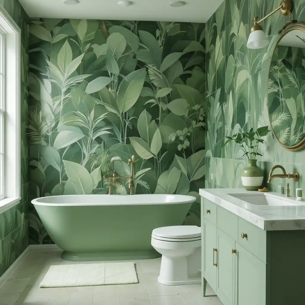 Use botanical or jungle-inspired wallpaper in green tones to create an accent wall. It brings life into the bathroom without needing actual plants.