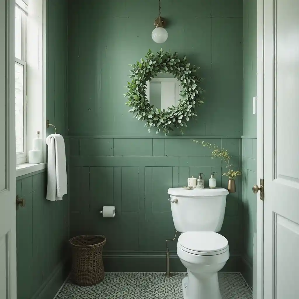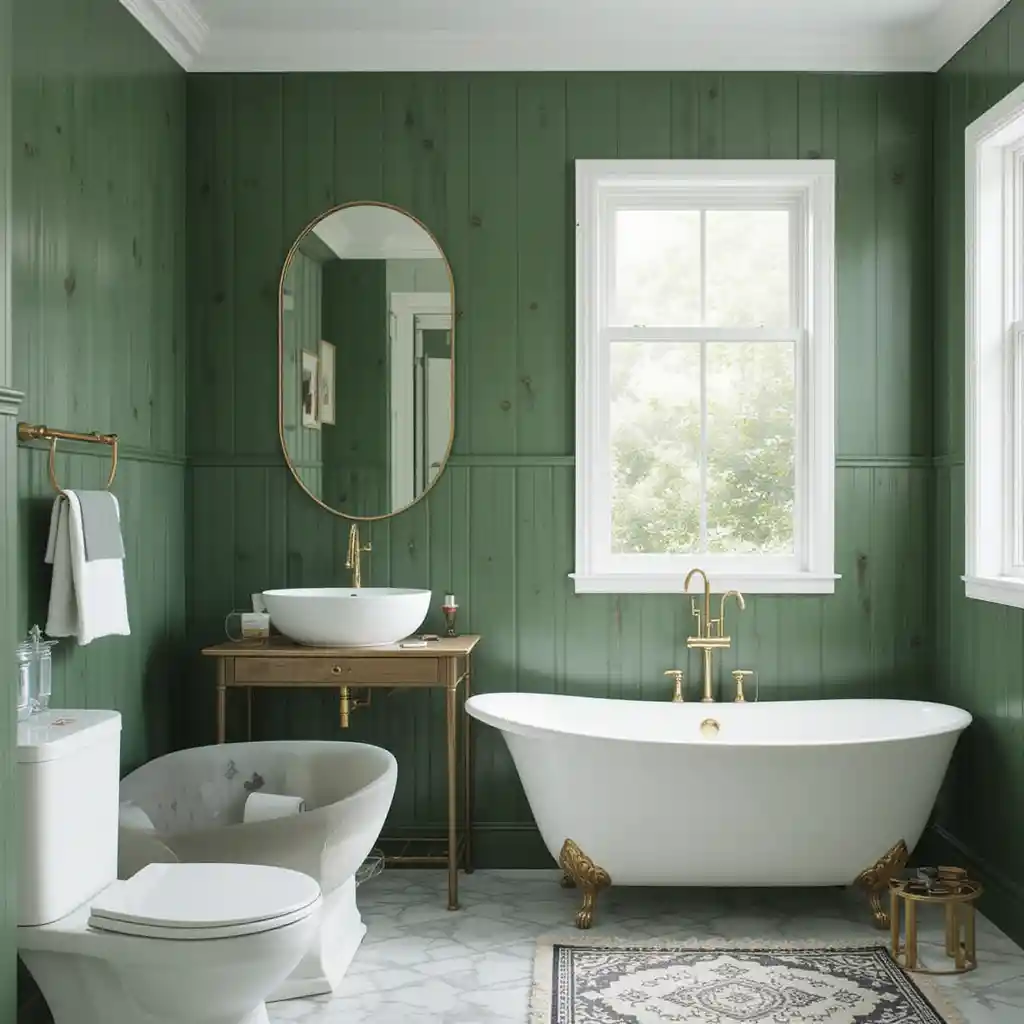 Line your walls with dark green shiplap to add rustic elegance. This works well in larger bathrooms and blends seamlessly with white marble or brass accents.