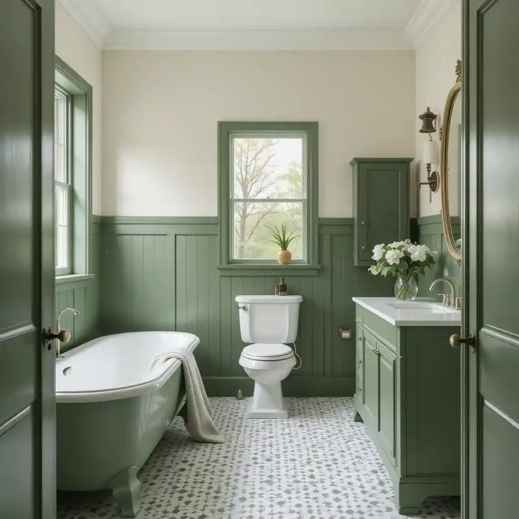 Combine olive green wainscoting with creamy white or beige paint above. This classic combo adds structure and vintage charm to any large or small bathroom.