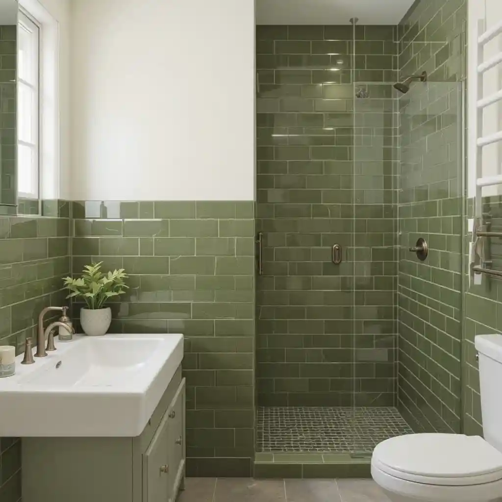 Install olive green subway tiles in the shower area to create depth and texture. This shade gives off a warm, natural tone that pairs well with neutral grouts and stone floors.