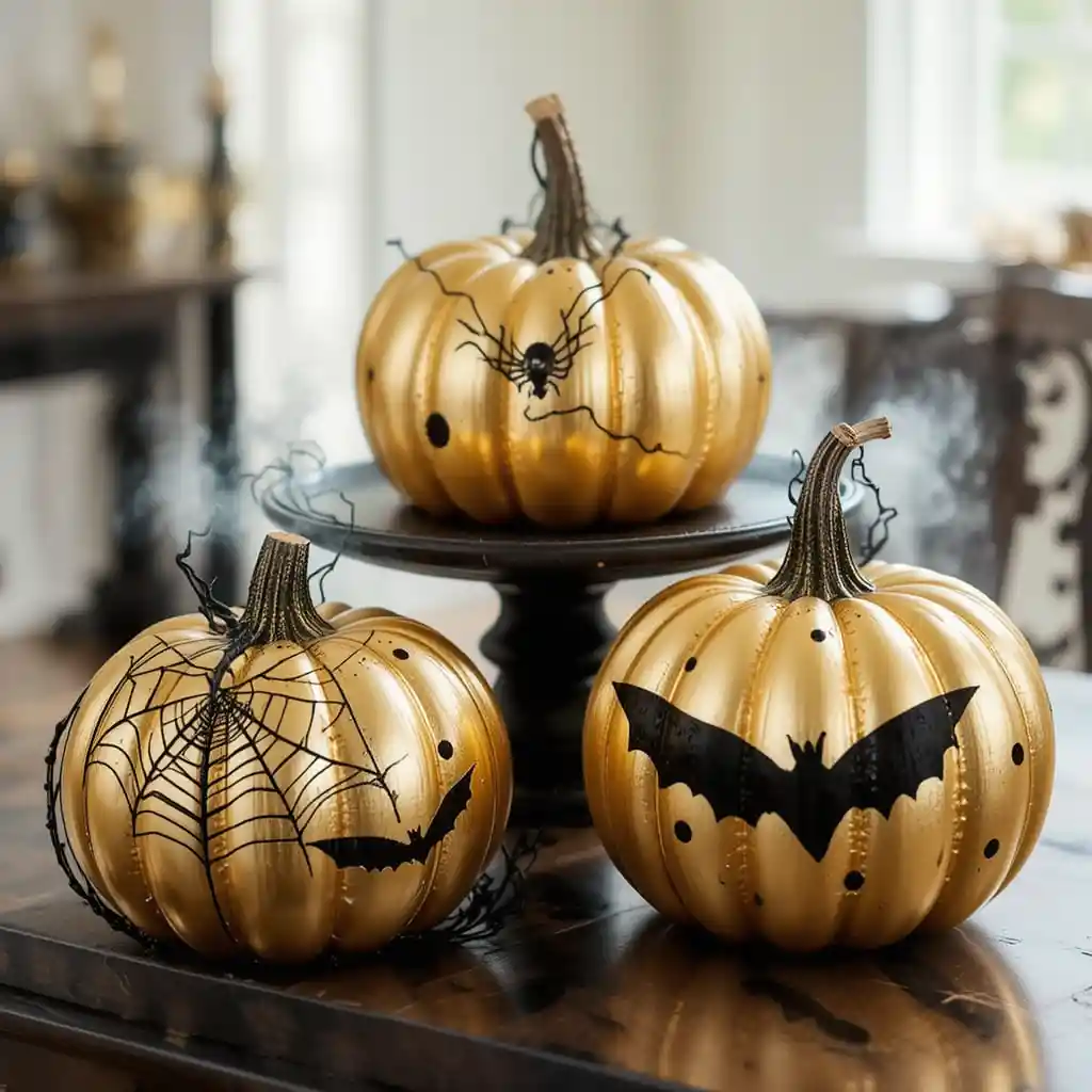 Spray-paint real or faux pumpkins in shimmering metallic gold and add black patterns like bats, spiderwebs, or polka dots. Place them on your mantel or dining table for a chic seasonal statement that’s easy to create.