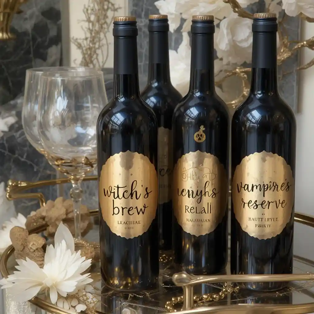 Upcycle empty wine bottles by spray-painting them black and adding custom gold labels like “Witch’s Brew” or “Vampire’s Reserve.” Display them on a bar cart for a festive touch.