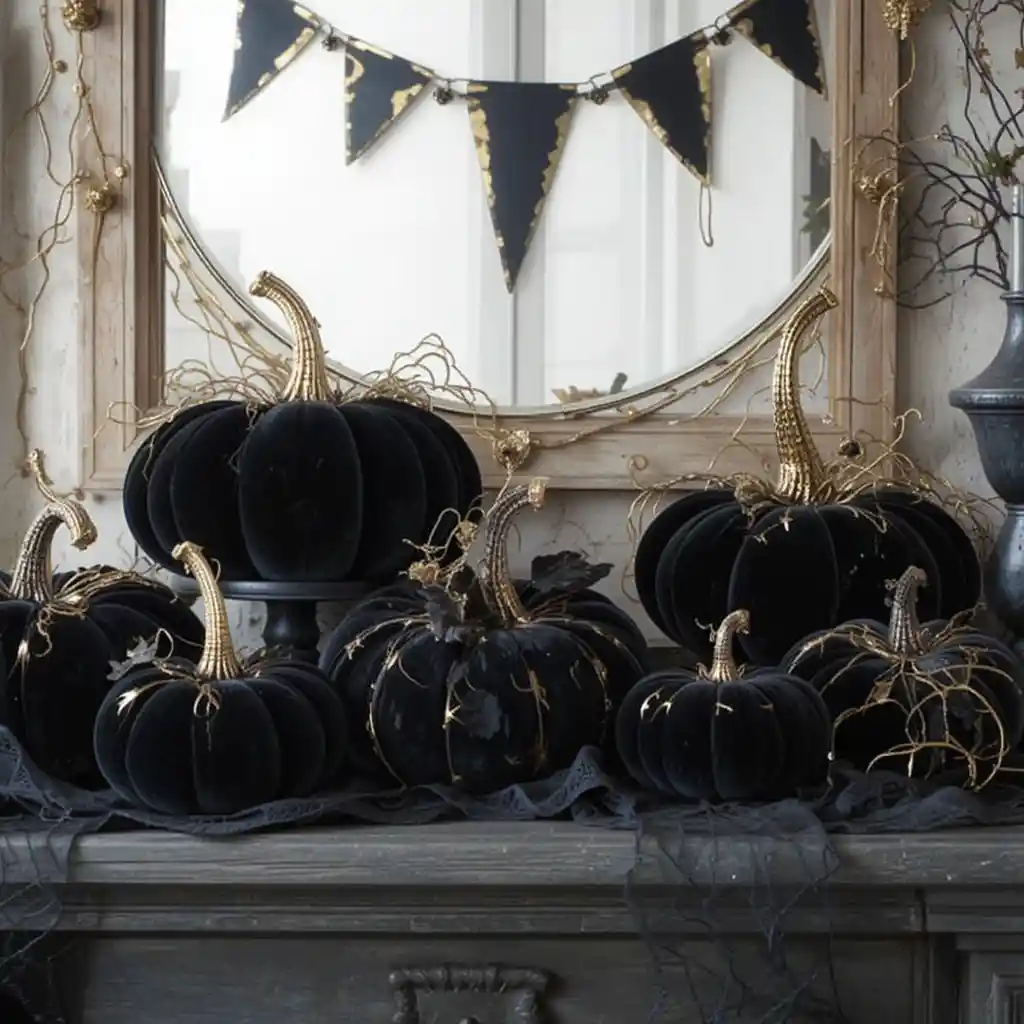 Velvet pumpkins add a plush, luxurious feel to Halloween décor. Choose black velvet pumpkins with metallic gold stems to create a soft yet elegant arrangement for shelves or mantels.
