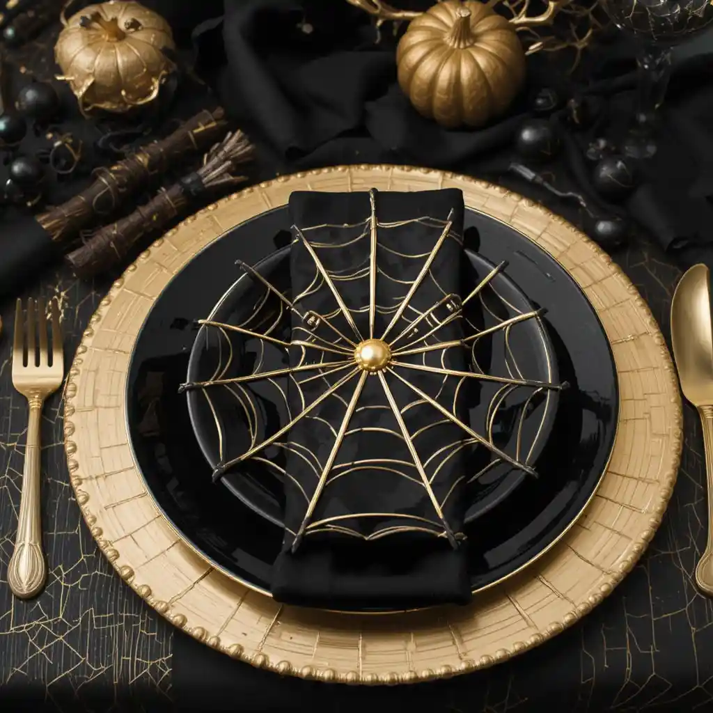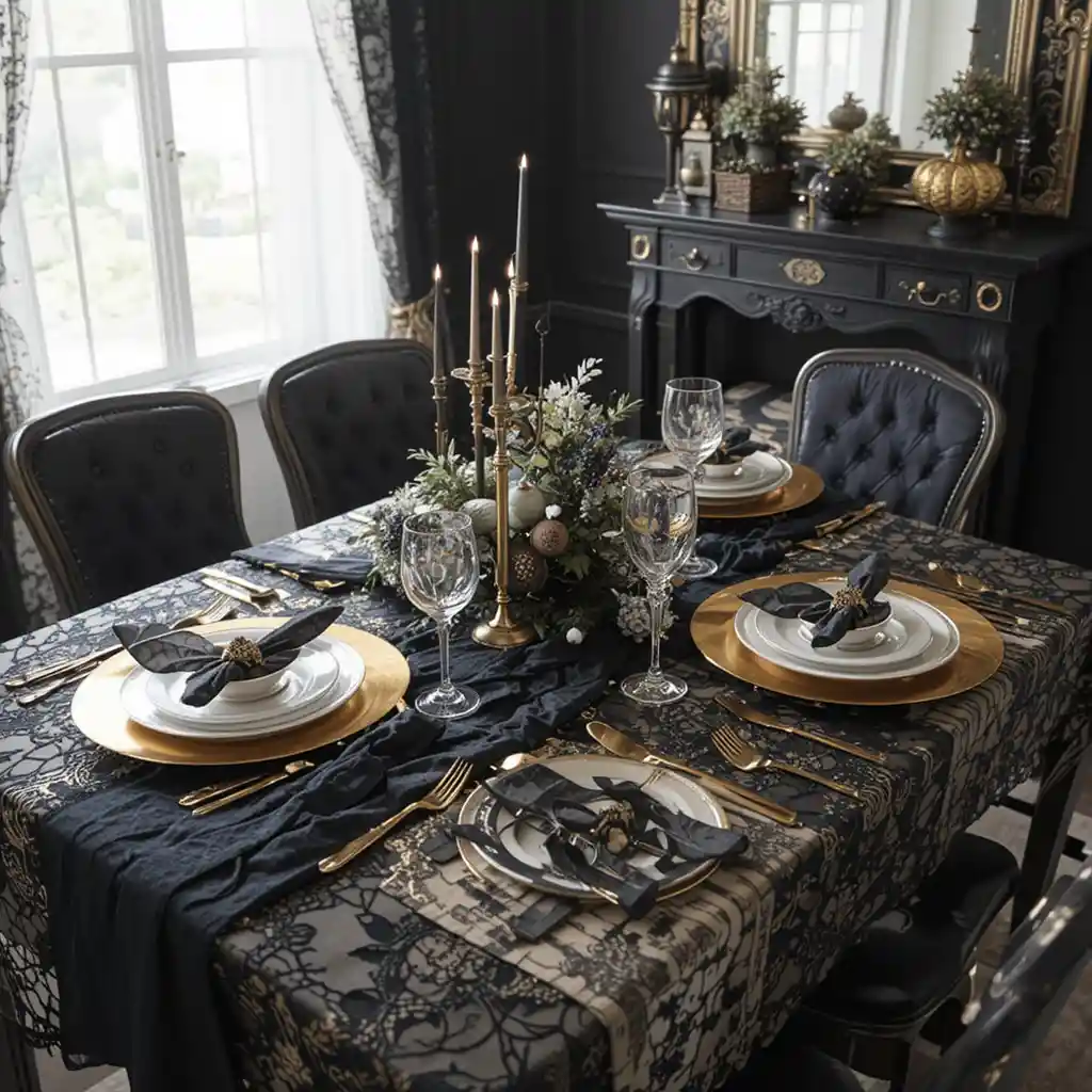 Drape a black lace tablecloth over your dining table and layer it with gold charger plates or placemats. This adds texture and elegance while staying perfectly in theme for a Halloween dinner.