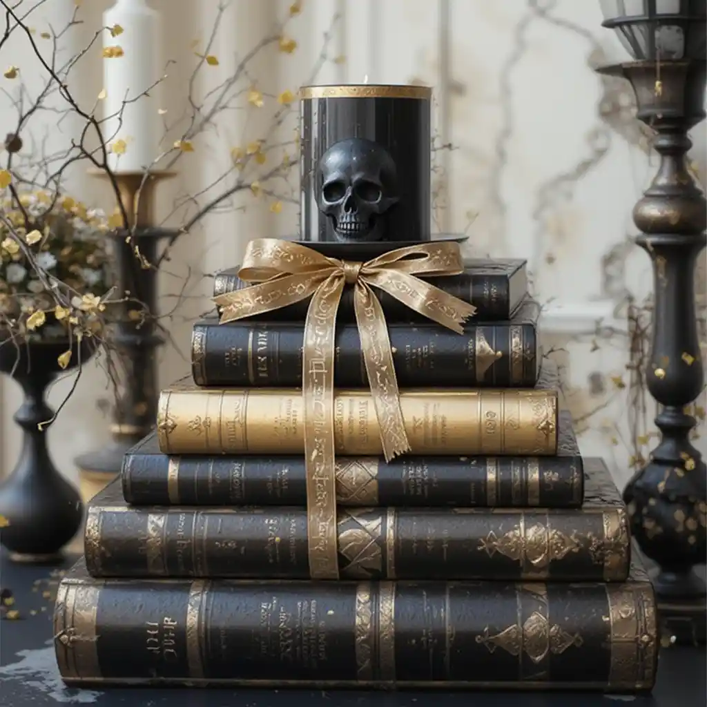 Stack vintage books with black covers and add gold-painted page edges. Tie them with gold ribbon and top with a small skull or candle for a subtle Halloween display. Gold n Black Halloween Décor Ideas