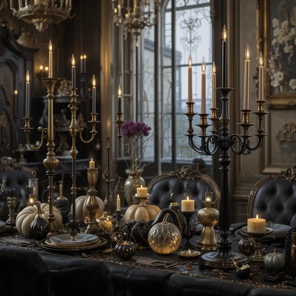 A tall black candelabra with gold candle holders instantly sets a dramatic mood. Use LED taper candles in gold or black for a safer option while still delivering that moody, gothic glow.
