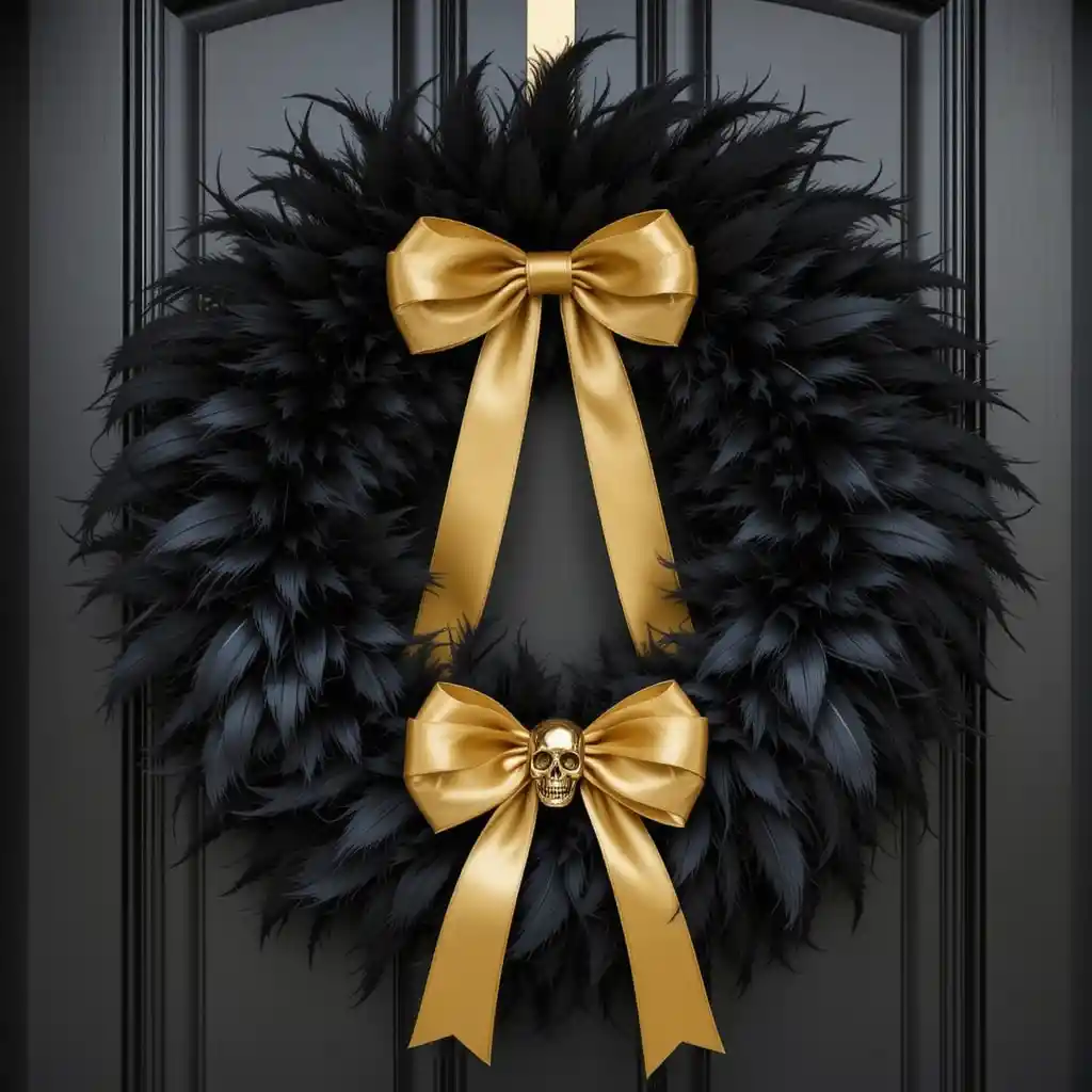 Hang a black feather wreath on your door and weave in gold satin ribbon or small gold skulls. This creates a luxurious welcome for guests and stands out from traditional Halloween wreaths.