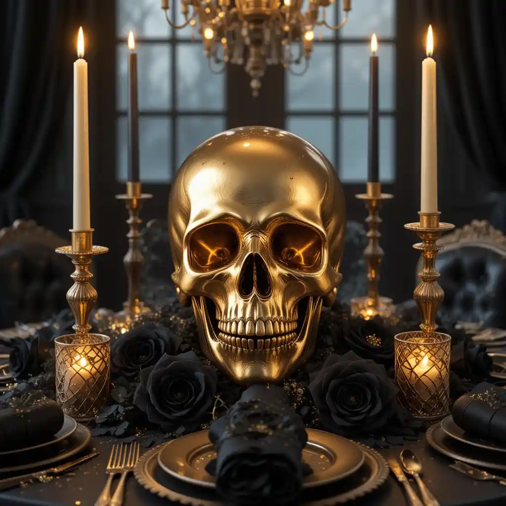 A large gold-painted skull makes a bold and stylish centerpiece. Surround it with black roses, candlelight, and gold glitter for a table display that feels spooky yet glamorous.