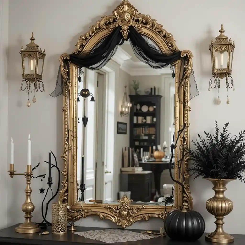 Find an ornate vintage mirror and spray-paint the frame gold. Add a black mesh drape or Halloween decals on the glass to make it look like a haunted heirloom piece.