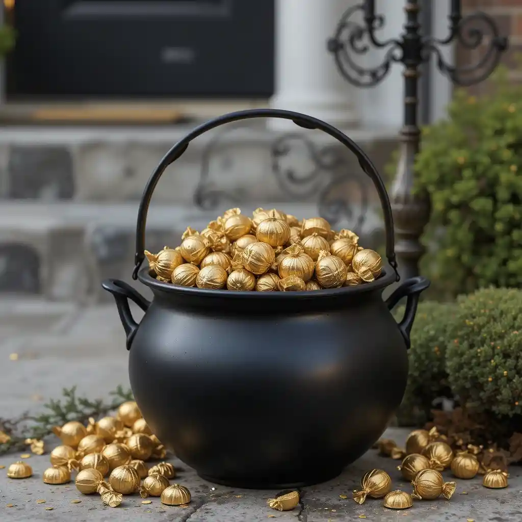 Fill a matte black cauldron with gold-wrapped chocolates or candy. It’s both decorative and functional, making it a hit for Halloween parties and trick-or-treaters.
