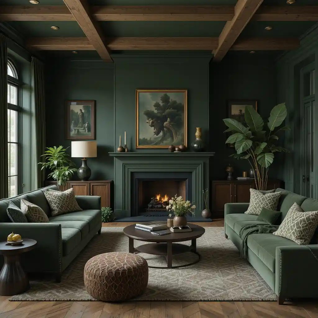 Mix dark green with warm wood tones in flooring, furniture, or ceiling beams. The combo evokes a nature-inspired, grounded vibe. Green Living Room