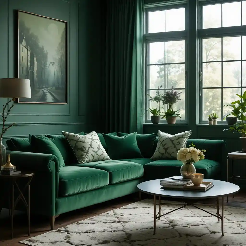 A plush forest green velvet sofa creates drama and depth while offering comfort. This bold piece becomes the heart of any moody living room.
