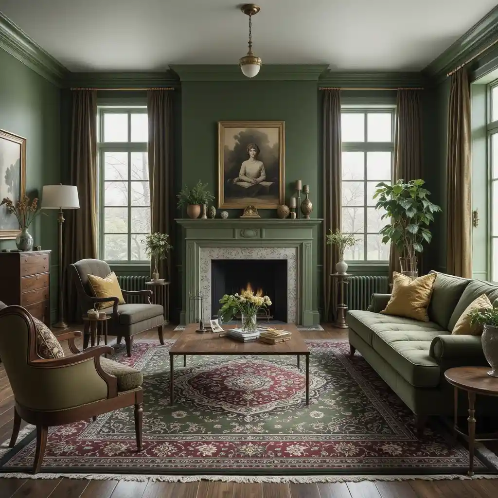 Add warmth and texture with Persian or vintage-style rugs featuring green, burgundy, and gold patterns that anchor your room with color.