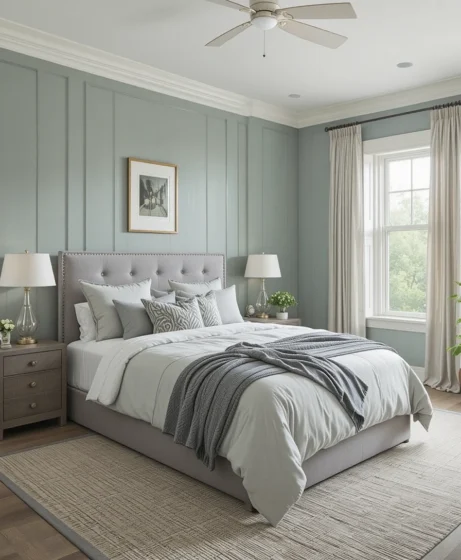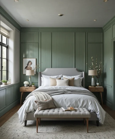 Installing grey wainscoting on the lower half of the wall creates an elegant foundation for green paint above it. This combination adds sophistication and visual height. It’s a timeless, polished design for classic bedrooms.