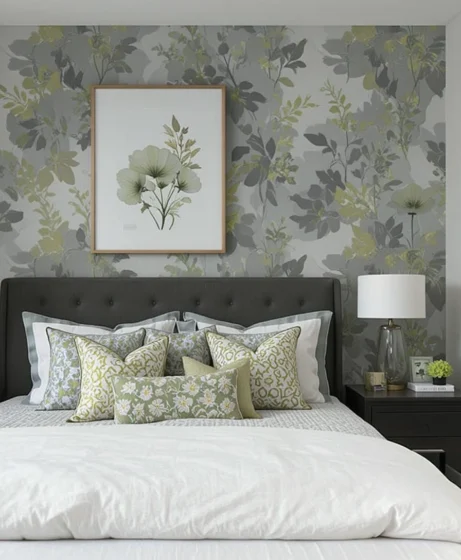 Wallpaper with botanical, geometric, or abstract grey-and-green designs adds instant character to any bedroom. It creates a visually interesting backdrop behind your bed or dresser. This idea works especially well for small bedrooms needing depth.