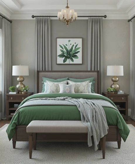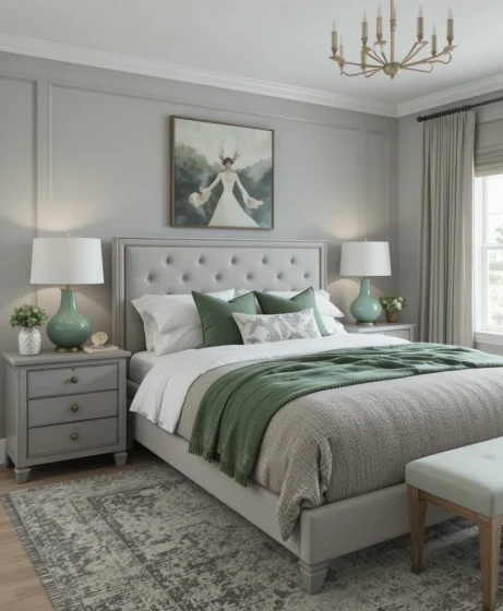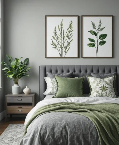 The combination of grey and green is becoming a top choice for American homeowners who love a soothing, modern, and nature-inspired bedroom.