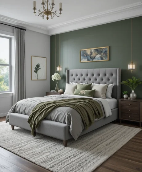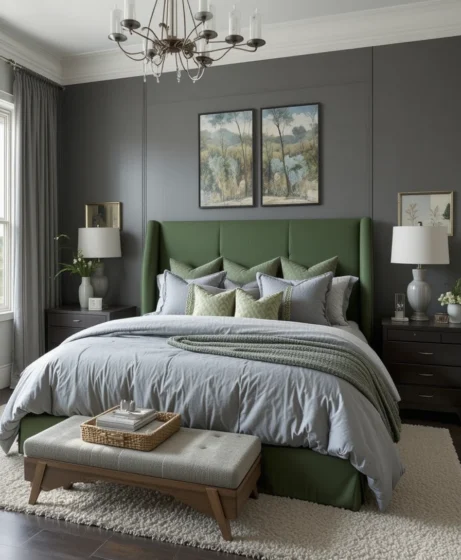 A grey upholstered headboard or bed frame stands out beautifully against a striking green accent wall. Choose shades like olive or forest green to ground the space. This look adds depth while keeping the room elegant and cohesive.