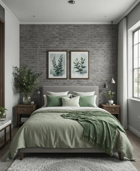 A grey brick wall—real or faux—adds an industrial yet cozy touch. Complement it with green accents like plants, cushions, or framed prints. The blend creates a chic mix of urban style and natural warmth.