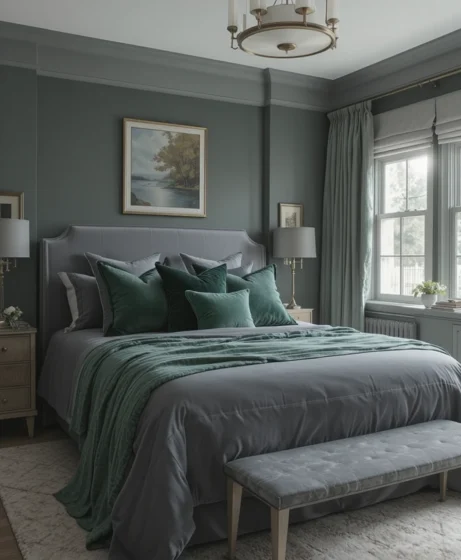If you love dramatic bedrooms, combine charcoal grey bedding with emerald green decorative pillows. The rich tones create a luxurious, stylish contrast. This pairing works beautifully in contemporary and mid-century Grey and Green Bedroom.