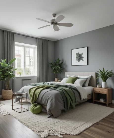 Real or faux green plants bring life to a grey bedroom instantly. Their natural color adds freshness without overwhelming the calm grey palette. Plants also make the bedroom feel warm, breathable, and effortlessly stylish Grey and Green Bedroom.