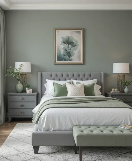 Painting the walls in soft sage green sets a relaxing tone in the bedroom. Balance the calm green shade with light grey bedding for a clean, airy look. This combination instantly creates a serene environment perfect for a modern, nature-inspired space Grey and Green Bedroom.