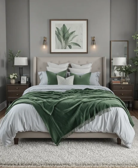 If your room has dark grey bedding, brighten it with textured green pillows. Choose materials like velvet, embroidery, or knit designs for contrast. The textures add warmth and depth to a neutral grey base Grey and Green Bedroom.