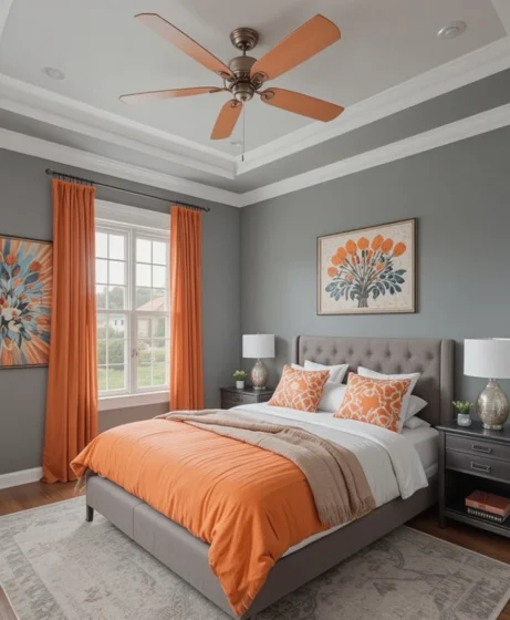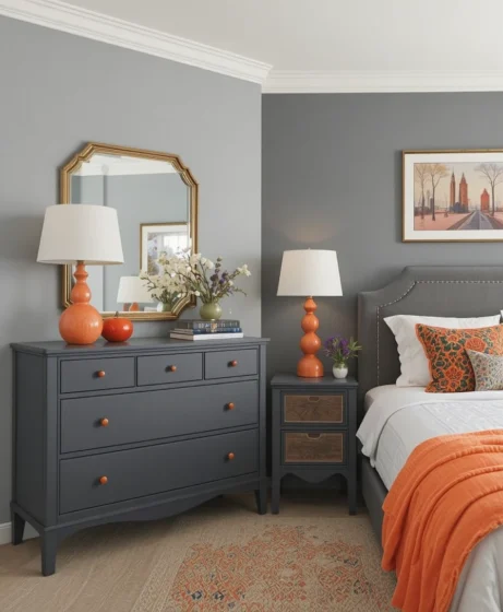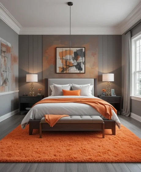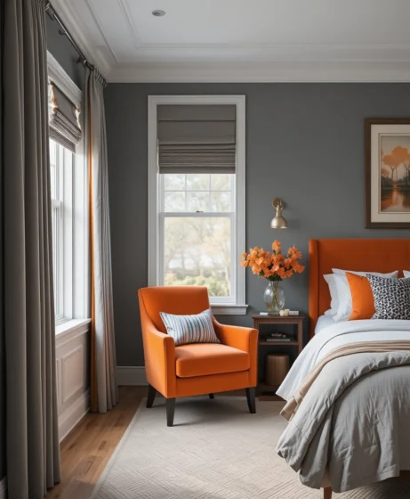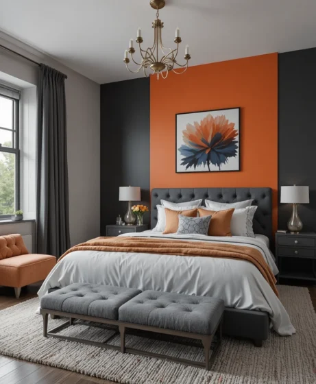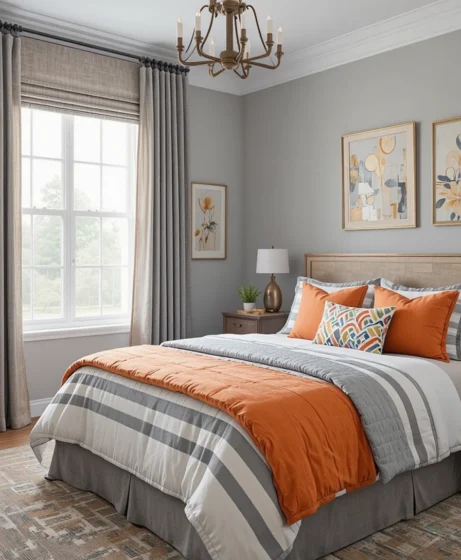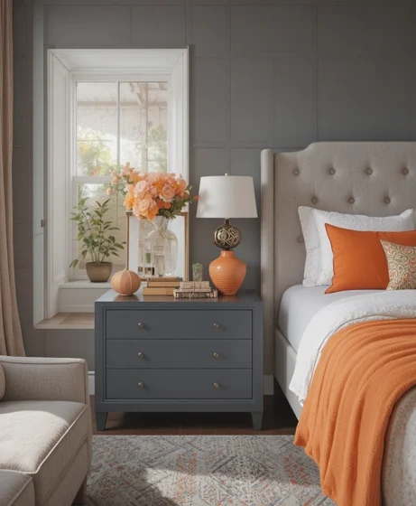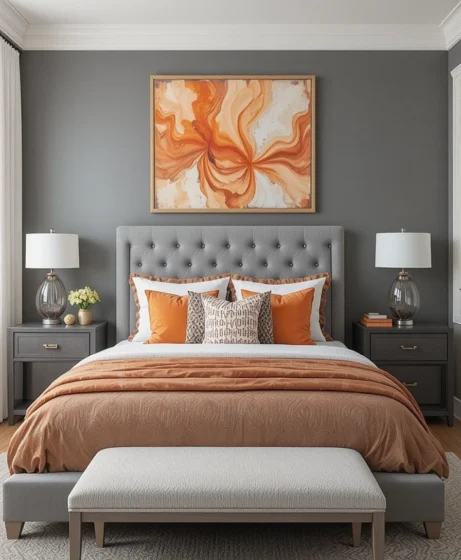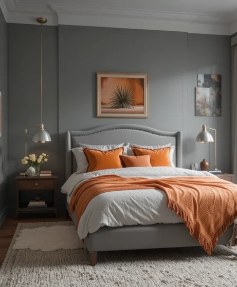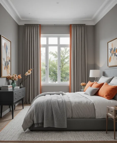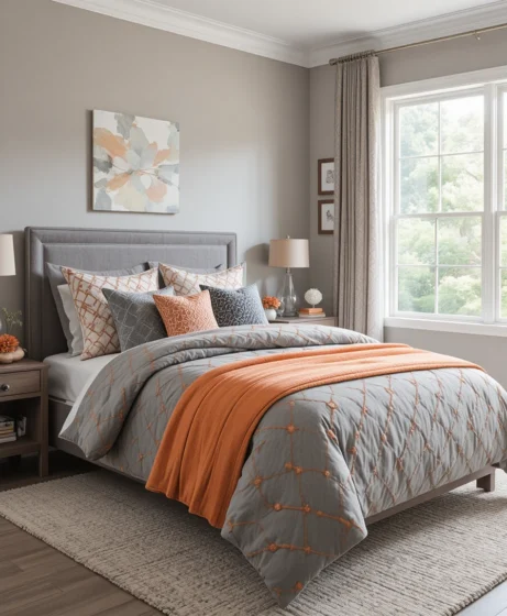 A grey and orange bedroom blends warmth with modern elegance, creating a balanced and refreshing atmosphere.