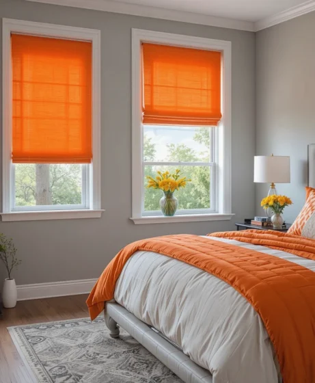 Choose orange roller shades or Roman blinds to pair with pale grey walls for a crisp, refreshing look. The brightness of the shades livens up the room instantly. It’s functional and stylish at the same time.